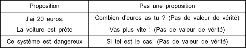 En logique classique, dans un contexte donné, une proposition est soit vrai soit fausse (jamais les deux). En d'autres termes, la valeur de vérité d'une proposition peut se représenter avec seulement 1 information (vrai ou faux). Cependant, si le contexte change, la valeur de vérité de la proposition peut changer. Bien que le nombre de contexte est souvent incommensurable, la proposition est, dans chacun de ces contextes, soit vraie, soit fausse. Même si ce concept peut paraître assez évident en logique, dans des cas où une formule dépend d'autres formules, établir sa valeur de vérité en fonction de ses propositions constituantes peut-être un peu dur. Heureusement, comme, dans tous les cas, une proposition est soit vrai soit fausse, c'est aussi le cas pour n'importe quelle proposition, aussi complexe soit elle (et aussi pour ses composantes). Donc, pour une proposition quelconque composée de "n" propositions différentes, ces "n" propositions peuvent toutes être soit vrai, soit fausse, et selon leurs valeur de vérité, la proposition composée est, elle aussi, soit vrai, soit fausse. Or, il est possible de représenter intuitivement cela, grâce à ce que l'on appelle une table de vérité. Une table de vérité est un moyen de représenter les valeurs de vérités une proposition composée selon chaque valeur possibles de chacune de ses propositions composantes. Ce concept peut être très pratique pour illustrer (voir démontrer) comment une proposition complexe se comporte avec ses propositions composantes. Voici deux exemples : une où la proposition "C" est vraie si "A" et "B" le sont toutes les deux (et fausses sinon), et "F" est vrai si "A" est vraie seule ou si "B" est vraie seule (et pas les deux en même temps). Théoriquement, on peut définir des proposition avec encore plus de composantes, mais la table devient longue à écrire (nous le démontrerons plus tard, mais la table doit contenir "2 exposant n" lignes).