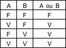 En pratique, comme avec le "et", personne ne va vous insulter si vous écrivez "OU" à la place de ce chapeau. D'ailleurs, demanière assez évidente, si "A et B" est vraie, alors "A ou B" est vraie (cependant, l'inverse n'est pas vraie : si "A ou B" est vraie, "A et B" ne l'est pas forcément). Sa table de vérité est :