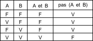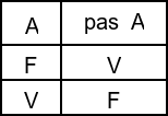 Cependant, en observant cette table, on peut remarquer quelque chose d'intéressant : la table de vérité de "pas A" est la table de vérité de "A" où les V et les F ont été inversés. En fait, la négation d'une proposition quelconque a pour table de vérité la table de vérité de la proposition de départ où on inverse les V et les F (les parties vraies deviennent fausses, et les parties fausses deviennent vraies). Si on essaye de construire la table de vérité de "pas (pas P)", on remarque qu'elle est parfaitement similaire à celle de P : donc "pas (pas P)" est égal à "P". Démontrer une proposition en démontrant que sa négation est fausse (ou mène à une contradiction logique absurde) est une méthode de raisonnement nommée le raisonnement par l'absurde.