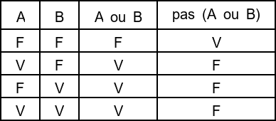 On peut donc chercher la négation du "ET" et du "OU" (démontrée juste ici) :
