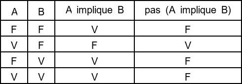 La table de vérité de l'implication est assez difficile à déduire. Essayons de la construire pour la proposition P stipulant "A implique B". Pour rappel, Le connecteur logique "implique" permet de lier deux propositions en une proposition finale "P", qui, si "A implique B" n'est vrai QUE SI la proposition A n'est vraie QUE QUAND la proposition B l'est aussi. Donc, si "A et B", alors P est vraie. Or, si "pas A et pas B", alors rien n'empêche P d'être vraie. Finalement, si "B et pas A" est vraie, c'est la même chose : rien n'empêche P d'être vraie. Cependant, si "A et pas B" est vraie, alors "A" est vraie quand "B" ne l'est pas : l'implication est fausse. D'ailleurs, la proposition "A et pas B" est la négation de l'implication.