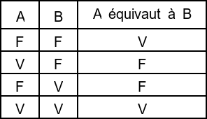 Nous avons vu l'implication dans le cas où nous ne connaissons pas le comportement de sa réciproque. Cependant, si une implication et sa réciproque sont vraies, nous avons un nouveau type de connecteur : l'équivalence. Le connecteur logique "équivaut" permet de lier deux propositions en une proposition finale "P", qui n'est vraie QUE SI les deux propositions de bases sont toutes les deux vraies ou toutes les deux fausses (elles ont l'exact même valeur de vérité). Dans ce cas, sa table de vérité est exactement la même que celle de "(A implique B) ET (B implique A)". Réciproquement, d'une équivalence, on peut en déduire ces deux implications comme vraies. On peut en déduire que, dans une équivalence, l'ordre ne change pas ("A équivaut à B" est parfaitement... équivalent à "B équivaut à A"). D'ailleurs, démontrer "A équivaut à B" revient souvent à démontrer que "(A implique B) et (B implique A)". Un exemple assez simple est encore l'exemple du "ET" : comme nous l'avons prouvé, la proposition "être de nationalité française ET être majeur" est équivalente à la proposition "être citoyen français" (sauf si les institutions ne font pas leur travail, mais cela reste rare). Une propriété très intéressante : si deux propriétés sont équivalentes, alors remplacer l'une d'elle par l'autre ne change absolument pas les valeurs de vérités, et donc ne pose aucun problème logique.