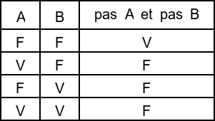 Maintenant, démontrons que la proposition "pas (A ou B)" peut s'écrire "pas A et pas B", toujours grâce aux tables de vérités.