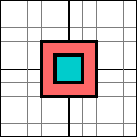 Comme cette application va de "R²" dans "R²", ce carré a une image dans "R²", que l'on peut facilement calculer. En effet notre carré est défini par ces sommets de coordonnées "(-1, -1)", "(-1, 1)", "(1, 1)" et "(1, -1)" : leur image est "(-2, -2)", "(-2, 2)", "(2, 2)" et "(2, -2)". Affichons graphiquement le résultat (ici en rouge, en arrière plan du carré de départ).