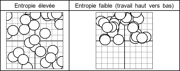 L'entropie est une grandeur assez complexe à comprendre. Elle se mesure dans un système physique. En fait, l'entropie représente une façon de calculer la quantité de travail potentielle encore possible dans un système instant T. Pour être précis, plus l'entropie est faible, plus ce potentiel est élevé. En réalité, l'énergie permettant de fournir ce travail, nommée énergie libre, s'obtient en multipliant l'entropie par une autre valeur : la température thermodynamique (traitée plus bas). En physique statistique, cette quantité de travail dépend de l'arrangement des particules / de l'homogénéité dans le système. En général, moins les particules sont ordonnées / plus le système est hétérogène, plus elles peuvent fournir de travail, plus l'entropie est faible. À l'équilibre (système homogène), l'entropie est très élevée : aucun travail précis n'est obstensible dans un état à l'équilibre. Elle se mesure en joules par kelvins, parce qu'elle peut aussi représenter la quantité de kelvins apportée à un système pour une certaine quantité de joules apportés à un système.